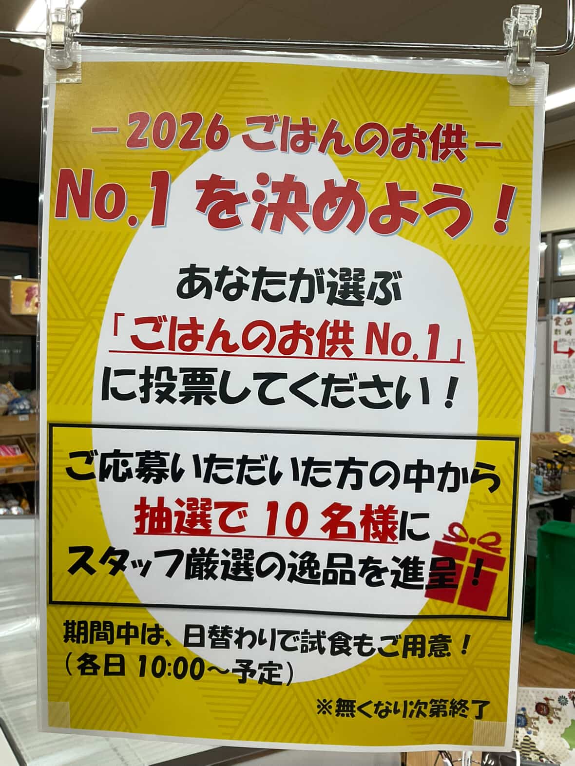 イベント 2026.01.30 ご飯のお供選手権2026開催! 毎年恒例!ご飯のお供選手権2026を開催しております。 キラキラスタッフが厳選したご飯の友にふさわしい商品がエントリー! 日替わりで試食もご用意しております。 エントリー商品の中から「食べてみたい」と思う商品にご投票いただくと、 抽選でプレゼントもございますので、ぜひご参加ください。 美味しいお米と一緒に、ご来店をお待ちしております! すべての記事一覧 イベント